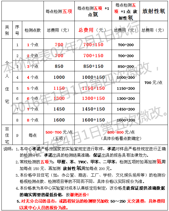另:地板检测(包括各种复合地板检测): 7.㈢、以上价格仅限个人家庭住宅内的空气检测;对无分公司的县市上门检测一律另加收 100~300 元交通费,具体费用视情形而定。 7.㈣、办公室、商店、工厂、学校、文化娱乐场所等的检测价格视检测点数、检测项目等的不同而不同,具体价格需视现场实际情形而定。 7.㈤、我中心人员上门采完样,签好合同后,我们收取全部检测费用,以利我们第3天告知检测结果。 7.㈥、特别提醒:由于进行空气检测采样用的吸收液均要求当天在实验室现配,该吸收液隔夜即失效(不允许再使用),为加强成本控制,本实验室每天一律不多配该吸收液,故当我们采样人员上门后您不能再要求增加采样点数,对要求减少采样点数的客户,一律加收样品损失费,1个采样点的吸收液加收50元整损失费;例如:你和我中心确定好做4个点(5项指标,共1300元),现场你改做3个点(5项指标),你应付1000+50=1050元。 7.㈦、对单位三废、单位废水、单位废气、单位噪声、单位环境检测等,麻烦你把贵单位的①单位名称、②单位地址(如果检测地址和单位地址不同,麻烦也写上检测地址)、③联系人及联系人的联系电话,最好写上联系人的手机号码、④要检测的项目(尽量详细)等发到我中心检测业务邮箱:jshjjc@163.com,我们收到邮件后会给你报价;当然你发完邮件后最好再打给电话告诉我一下,谢谢理解! ■ 8. 封闭过程及检测过程中不准开空调和换气扇(中央空调和客户特别要求除外,但必须记录在案)。 ■ 9. 封闭过程和检测过程中不要进行影响测试结果的活动,如吸烟和用燃气灶等。 ■ 10. 检测现场需清理干净,不能堆放残余的涂料、油漆、板材等。 ■ 11. 封闭过程和检测过程中不要使用化工产品,如空气清新剂,香水等等。 ■ 12. 检测过程中每个房间的门尽量相互关闭,不要保持通风。 ■ 13. 人员进行室内环境检测前,您应要求检测人员出示相应的职业资格证书,并核实该证书上的照片是否为其本人,否则您可以拒绝该检测人员进行检测。 ■ 14. 检测过程中检测人员和其他人员共计人数最好不得超过 3人,尽量减少人员活动对检测的影响。 ■ 15. 上门进行空气采样耗时:每个检测点采样耗时约 25分钟, 3个检测点采样耗时约 75分钟, 4个检测点耗时约 100分钟。 ■ 16. 出具报告时间:自取样之日始,第 5个工作日左右提供 CMA报告,如客户确有需要,可提前约一天电话告知检测结果。 ■ 17. 根据检验报告结果,本公司针对每户的实际情况有针对性的出具一份室内环境污染评价建议。 ■ 18.友情提醒:由于现在市场上喷洒化学药剂的治理办法没有任何国际标准或行业标准,对治理用的药剂是什么成分无法知道,对药剂本身是否有污染无法确定,对治理后是否产生新的污染物(该新的污染物可能现在我们还没有发现,或该污染物现人们知道但不知道是哪种)也无法知晓,故现在我们不推荐进行使用化学药剂的任何治理方法。不能进行化学治理的原因,详:点击进入 >> |